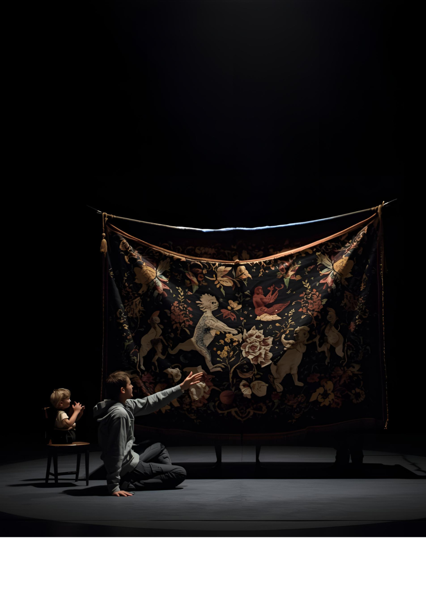 Állsz gyerekként a szőnyeg szélén, megszeppenve, legörbült szájjal, mert már megint rossz voltál.Vajon hányszor mondtuk már legyintve azt, hogy na, ez is megy a szõnyeg alá? Be lehet tartani azokat a gyerekként tett fogadalmainkat, amelyek arról szólnak, mi majd mit csinálunk másként, jobban mint a szüleink? Mikor jön el a pillanata annak, amikor már hálás vagy minden apró gesztusért vagy mondatért, amit magadban hordozol a szüleid, nagyszüleidből. Elõadásunkban belépünk a gyerekszobába és egy képzeletbeli kárpit alá nézünk, hogy kisöpörjük odarejtett emlékeinket. Apáinkhoz fűződő kapcsolatunk témáját dolgozzuk fel, szöveg, mozgás és zene szintézisével, melyhez Dragomán György Oroszlánkórus című kötetének egyes novelláit használjuk fel.